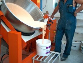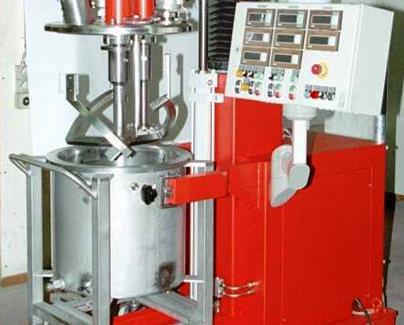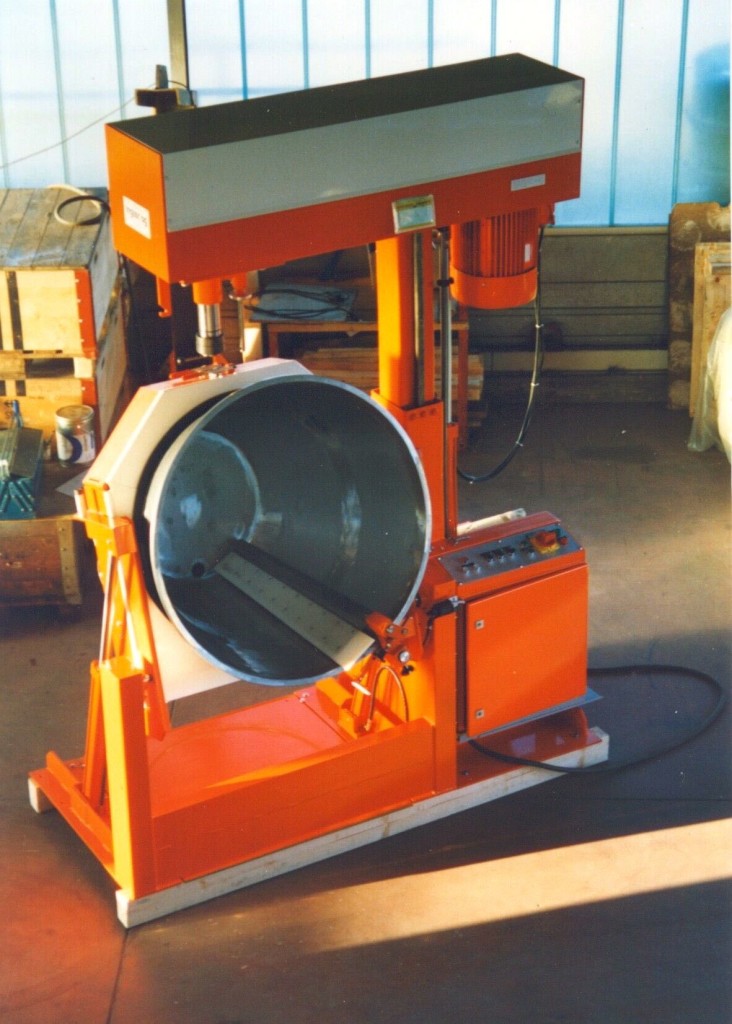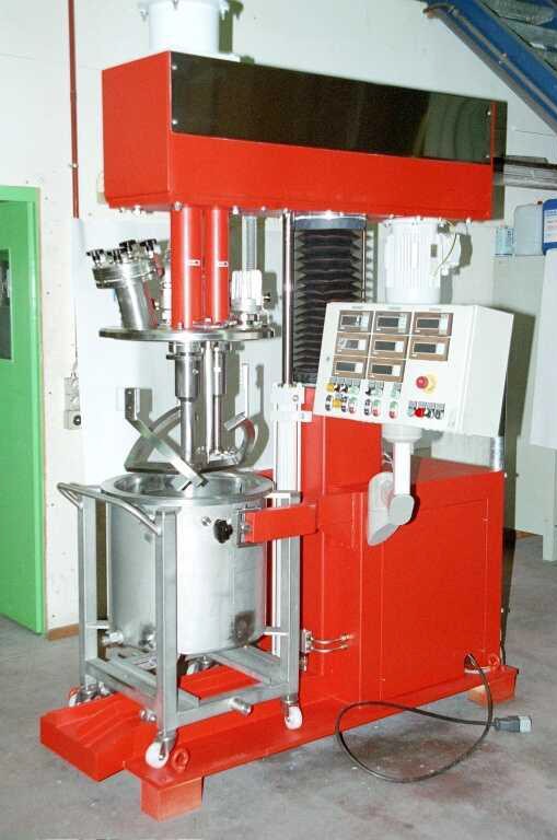 Das Mischen oder Dispergieren der Produkte erfolgt in einem konisch rotierenden und fahrbaren Kessel mit feststehendem Abstreifer. Die Wellendrehzahl ist stufenlos einstellbar. Der intermittierende Kurzhub kann während des Mischvorganges optimal eingestellt werden. Zur Entleerung wird der rotierende Mischkessel bis zu einem Winkel von 90° stufenlos gekippt (Keine Auslauf – Keine Sackbildung!). Schnellkupplung für die Mischerwelle. Geringer Reinigungsaufwand für die Kesselreinigung.