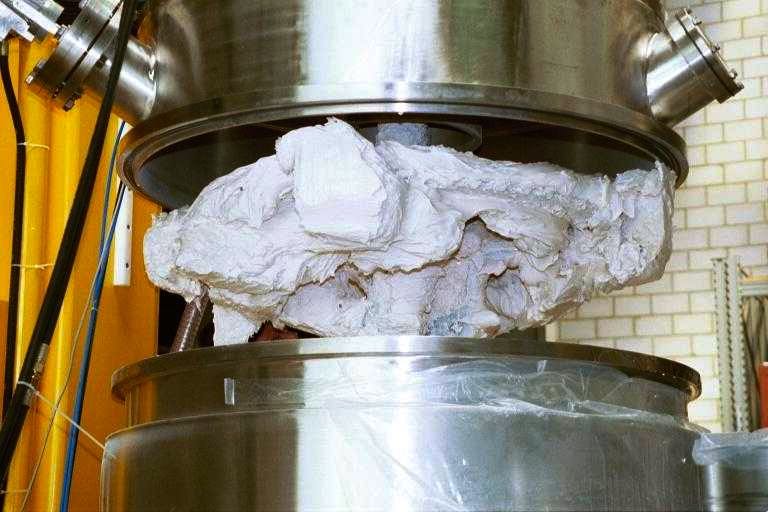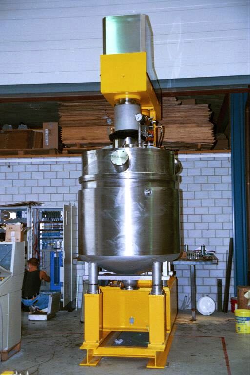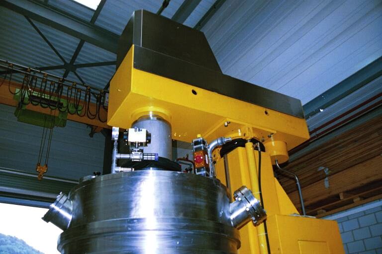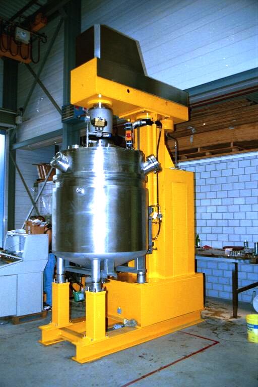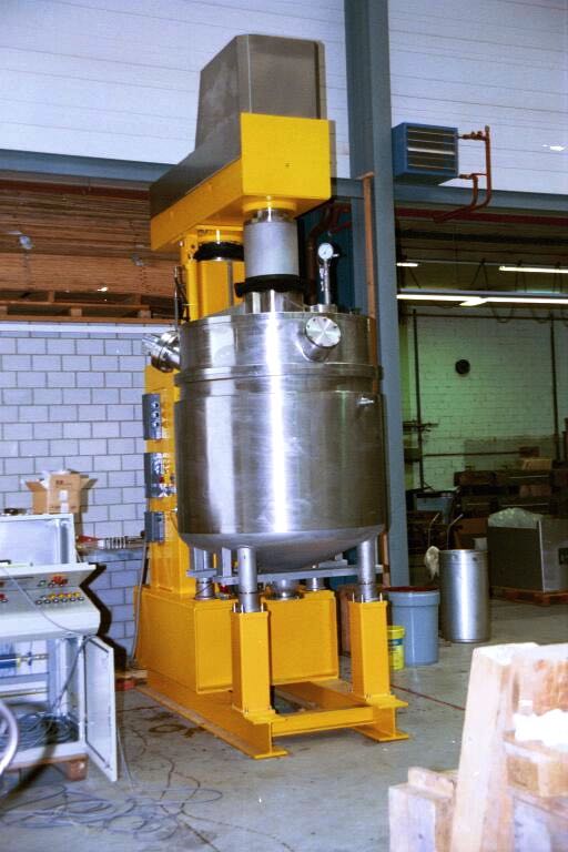 Nach Beendigung eines Prozesses wird die drehende Welle mit dem Mischorgan unter Vakuum aus der Masse hochgefahren, sodass einerseits keine Luftblasen entstehen und anderseits das Produkt vom Werkzeug abgeschleudert wird.